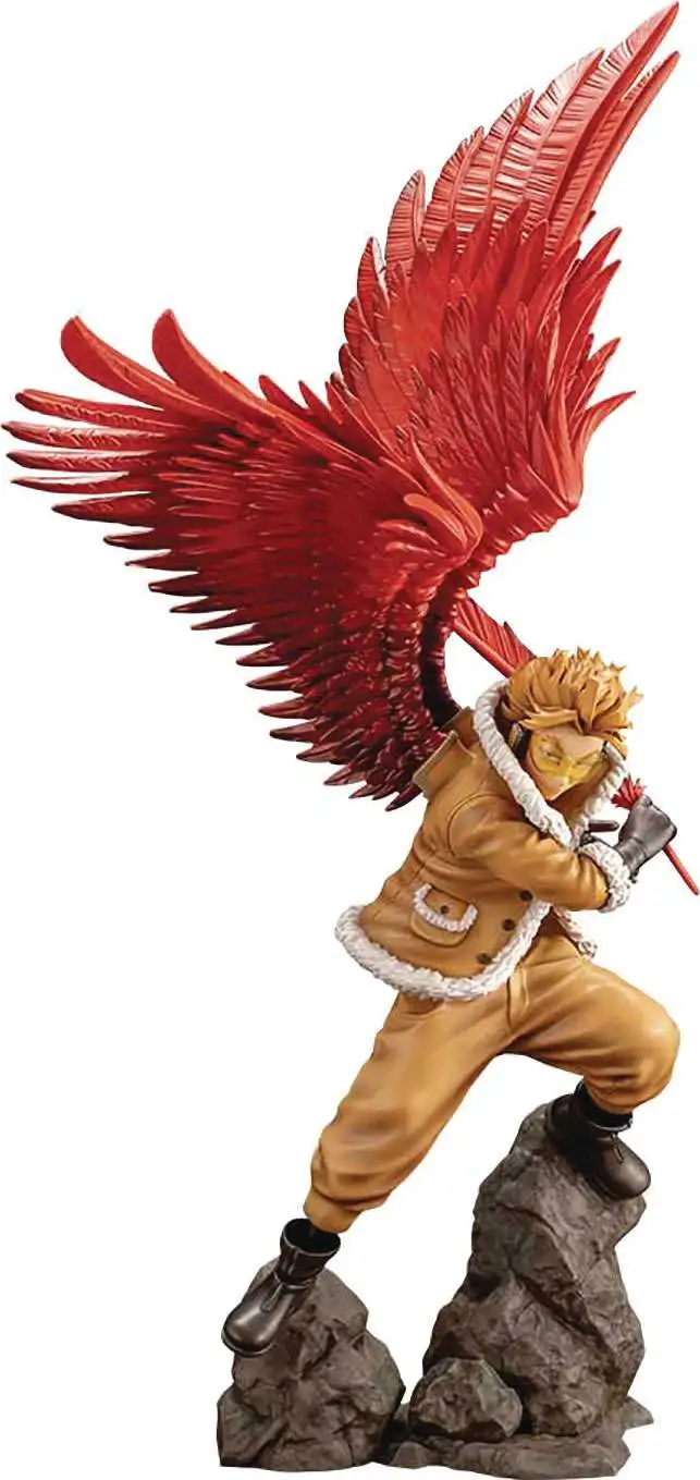From Kotobukiya. From the hit anime series My Hero Academia, the Wing Hero Hawks is joining Kotobukiya’s scale figure lineup! Hawks is portrayed in the moment as he is facing off against a villain. The statue’s action-packed posing shows the hero ready to use his wings as swords. Be sure to also take notice of the detailed and dynamic sculpting of his two wings and add this stunningly detailed piece to your collection today!