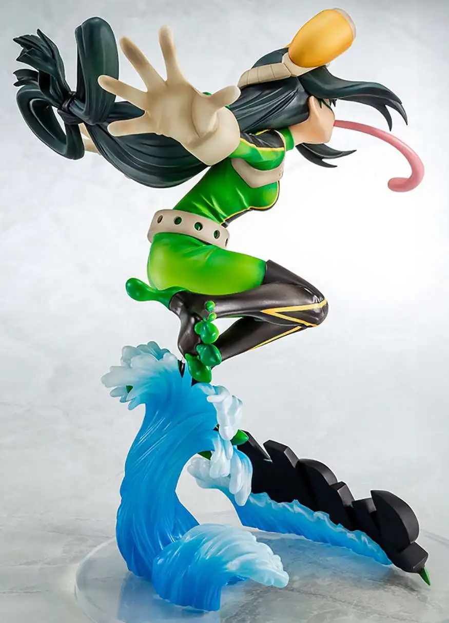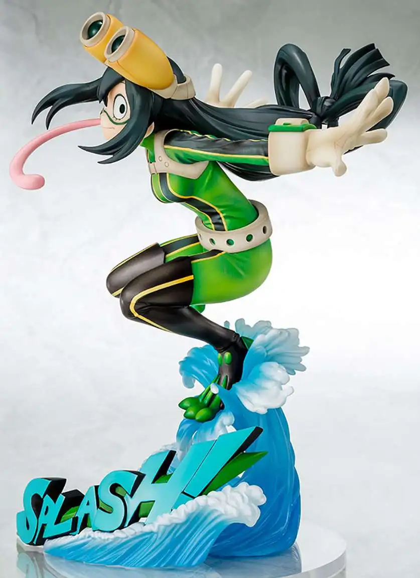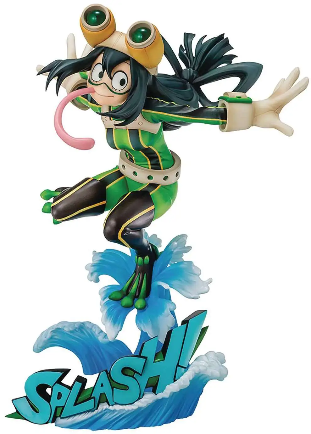 From Bellfine. Wearing her hero suit, Tsuyu leaps into the air with her frog powers, from her big jump to her long tongue. Her base also features a dynamic splash, accompanied by a comic-book style sound effect. Optional parts allow her to be displayed with her helmet off, and without her tongue hanging out. Stands approximately 8″ tall.