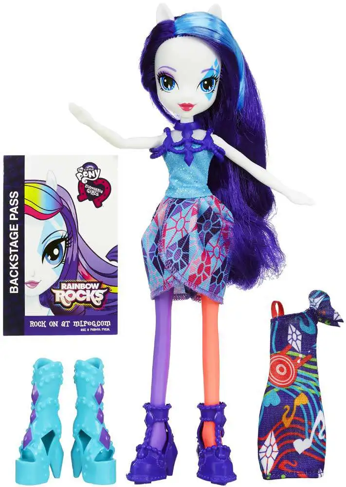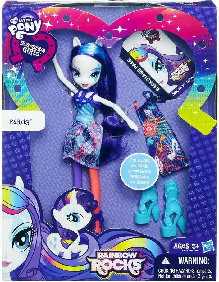 This wonderful storytelling set of 2 features a My Little Pony Equestria Girls Rarity doll together with a Rarity pony figure. Your Rarity doll comes wearing a dazzling rock star outfit with cute purple shoes, and she is ready to strike a rockin’ pose holding her cool, personalized keytar. Your special Rarity pony reflects the Equestria Girls style with a matching diamond-shaped Cutie Splash design and rainbow-fied hair! You can style their pretty hair with the included brush.buy = ‘Y’;