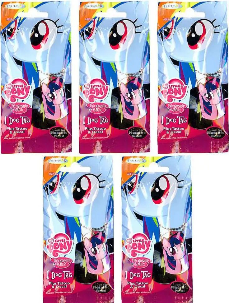 My Little Pony collectible dog tags in blind packs! Each MLP dog tag pack includes not only 1 of 33 stunning dog tags with epoxy finish and metallic effects, but there’s also a very nice decal sticker, tattoo set, and a 22 Inch ball chain.