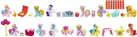 Get 12 mini ponies! Set includes SWEETIE SWIRL, FIRECRACKER BURST, LILY BLOSSOM, BUMBLESWEET, LEMON HEARTS, PEPPERDANCE, SUGAR GRAPE, LULU LUCK, RAINBOW FLASH, SWEETIE BLUE, BLOSSOMFORTH and FLOWER WISHES ponies. More than 20 accessories! Accessories include a tea set, pretend pizza, and other party things!