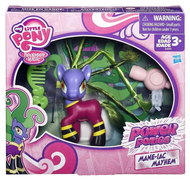 Wild and wacky fun is on its way with this maniacal pony pal! This Mane-iac Mayhem figure is an unpredictable pony and she’s got the magical ringlets to bring mayhem to any adventure. You can style her hair with the included comb so she never looks less than fabulous while she’s making chaos! Create your own wackiness with this Mane-iac Mayhem figure!