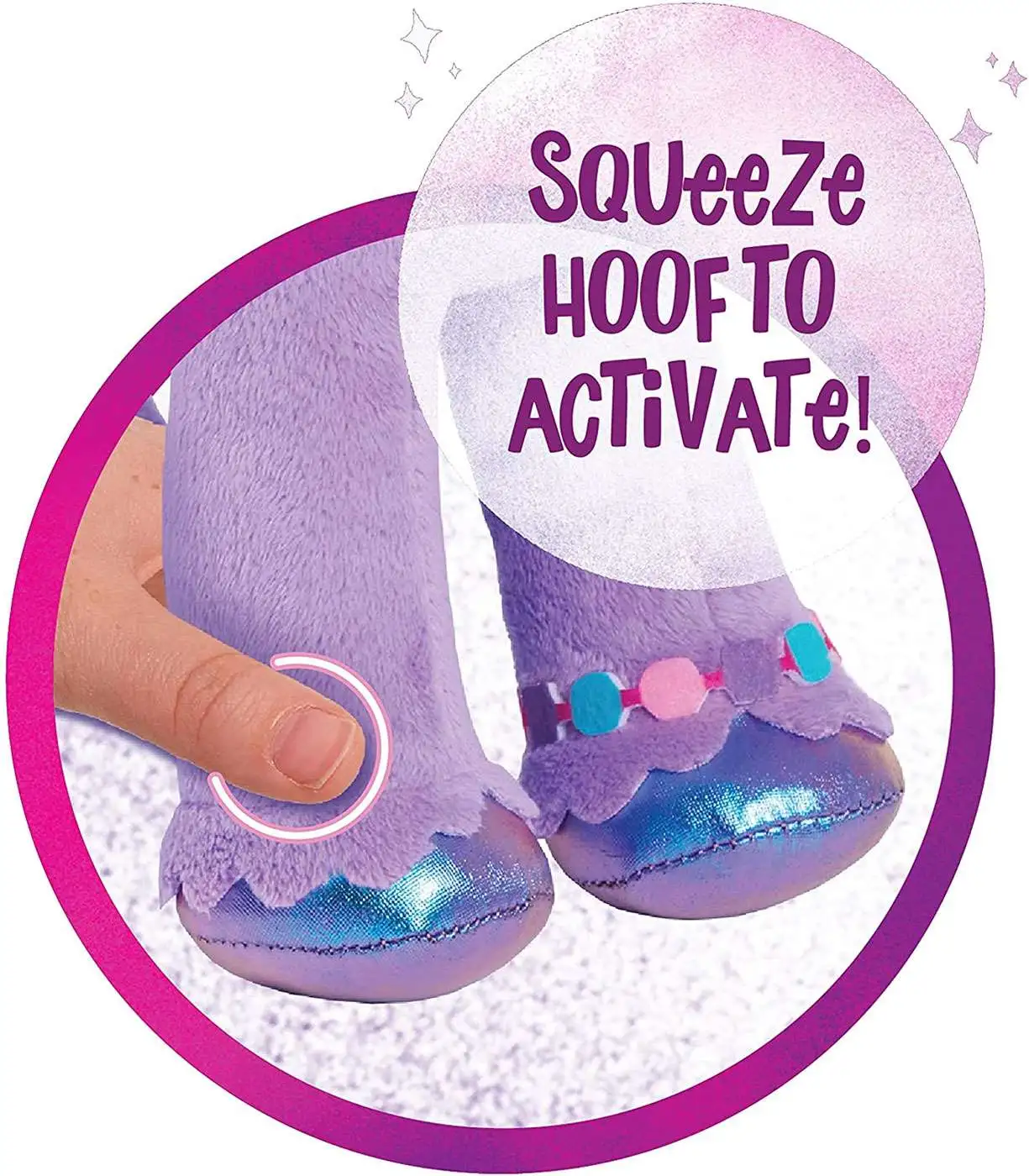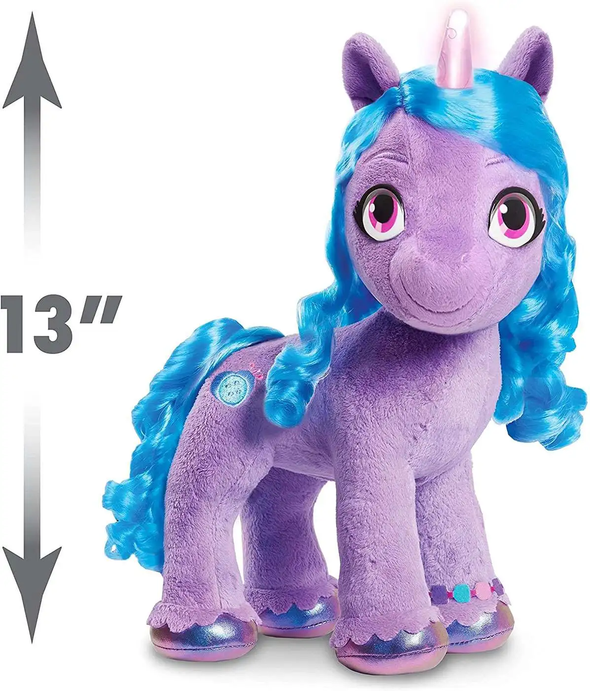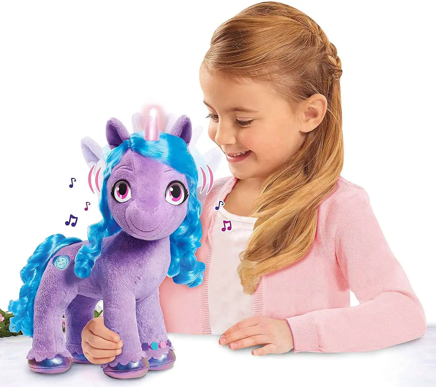 We all need Unicorns, and little besties will love harmonizing with the My Little Pony Sing & Glow Izzy! This magical Unicorn looks just like she does in the movie, and even features a light up horn, which shines when she sings! Made with deluxe plush fabrics and iridescent accents, Izzy features her bright blue mane and tail, purple horn, and adorable bracelet (non-removable). Squeeze her right hoof to have a magical dance party and watch as her horn lights up while she sings. Her head even moves from side to side to the song Fit Right In. Izzy even features her embroidered Cutie Mark! The My Little Pony Sing & Glow Izzy is a great gift for any My Little Pony fan! Require 3 x AAA batteries (included). Ages 3+ 2021 Hasbro