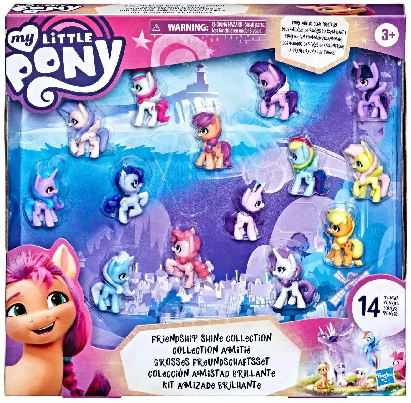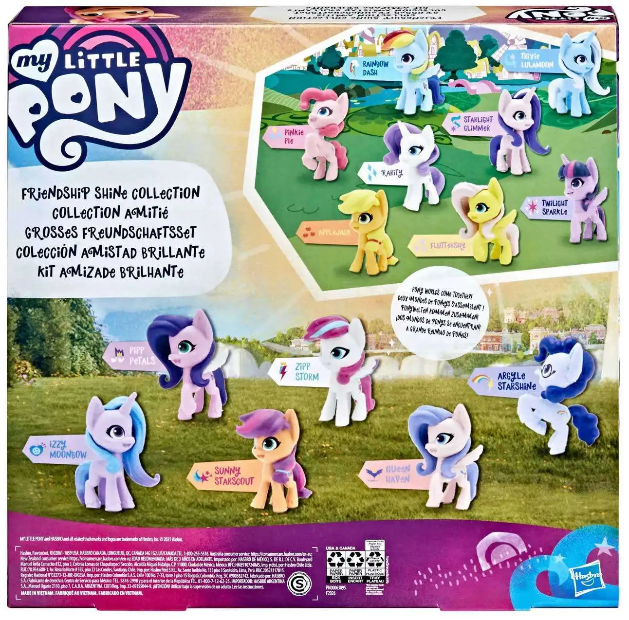 Friendship Shine Collection pack includes 14 pony figures with character-inspired colors, hair styles, and Cutie Marks. From My Little Pony: A New Generation, meet Sunny Starscout, Izzy Moonbow, Princess Petals, Zipp Storm, and Queen Haven. Also includes Sunny’s Dad, Argyle Starshine! From My Little Pony: Friendship is Magic, reimagine the magic of Twilight Sparkle, Applejack, Fluttershy, Rarity, Pinkie Pie, Rainbow Dash, Starlight Shimmer, and Trixie Lulamoon.