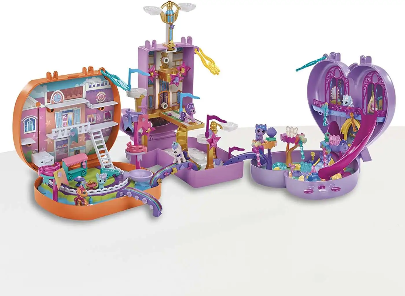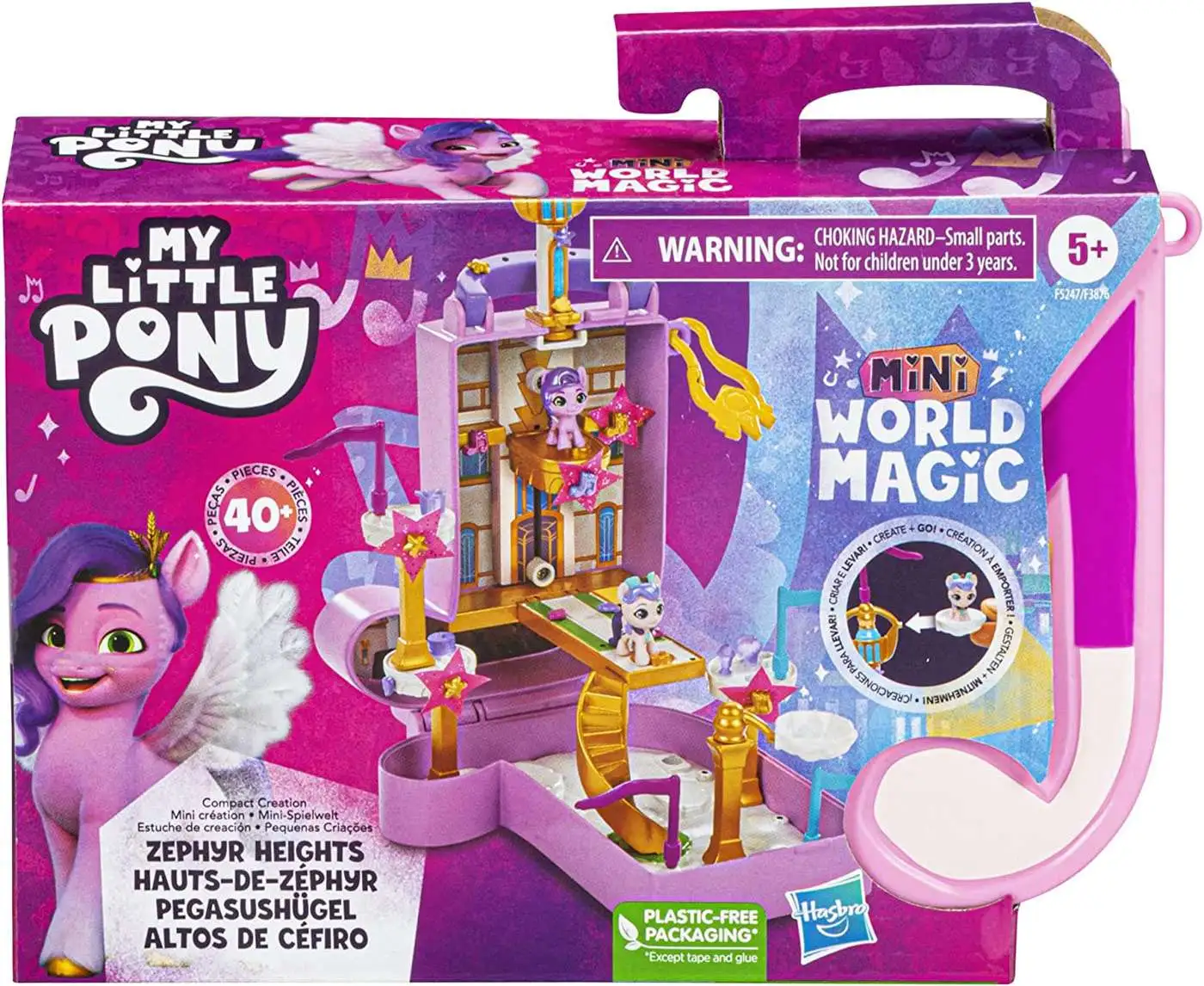 Build a world of magical mini friends from across Equestria! My Little Pony Mini World Magic sets consist of tiny scenes and adorable characters inspired by the My Little Pony: Tell Your Tale series. This Compact Creation set comes with 2 adorable figures that are 1 inch tall: Princess Pipp Petals and Queen Haven! Comes with over 40 pieces for customizing a scene in Zephyr Heights. Build the world with towers and clouds, set up the royal elevator, and hang cloth stars. Plug accessories and scene-building pieces into the playset to create a mini world, then use the included sticker sheet to customize the scene. Fill the cloud container with cold water and place the treats inside for a color-change reveal. Imagine finding snacks in the clouds with Pipp and Queen Haven! These travel toys for girls and boys come inside a carrying case for on-the-go fun. These toys for 5 year old girls and boys and up make great holiday or birthday gifts for kids who love horse toys!