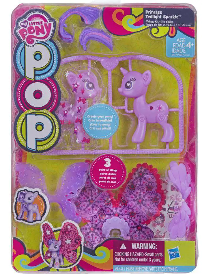 Design a winged pony your way with the Princess Twilight Sparkle Wings Kit! Just pop the Princess Twilight Sparkle pony body out of the frame and snap it together. Then you get to decide which pair of wings to put on her, and add hair and a tail! With 2 sheets of stickers, you’ll decorate her the way you want, and you can even mix and match parts from other ponies (other kits sold separately) for more unique and sassy looks! Customize your own pony in all kinds of ways with the Princess Twilight Sparkle Wings kit! My Little Pony and all related characters are trademarks of Hasbro.