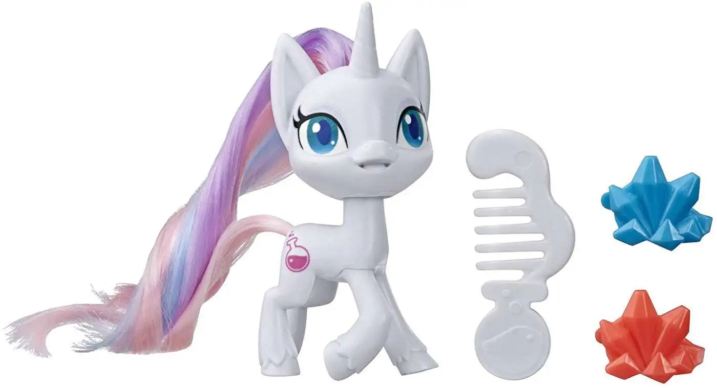 This Potion Nova Potion Pony 3-inch figure is a white pony toy with a pink, blue, and purple mane and tail. Figure comes with a comb and 4 surprise hair play accessories. Tear open the potion bottle-themed pack and pour out the accessories for styling her long brushable hair! Potion Ponies feature a reimagined form factor for a fresh and adorable take on the original My Little Pony figure design. Also look for Fluttershy, Twilight Sparkle, Applejack, Pinkie Pie, and Trixie Lulamoon Potion Pony figures to share accessories and imagine adventures in Equestria! (Each sold separately. Subject to availability.)