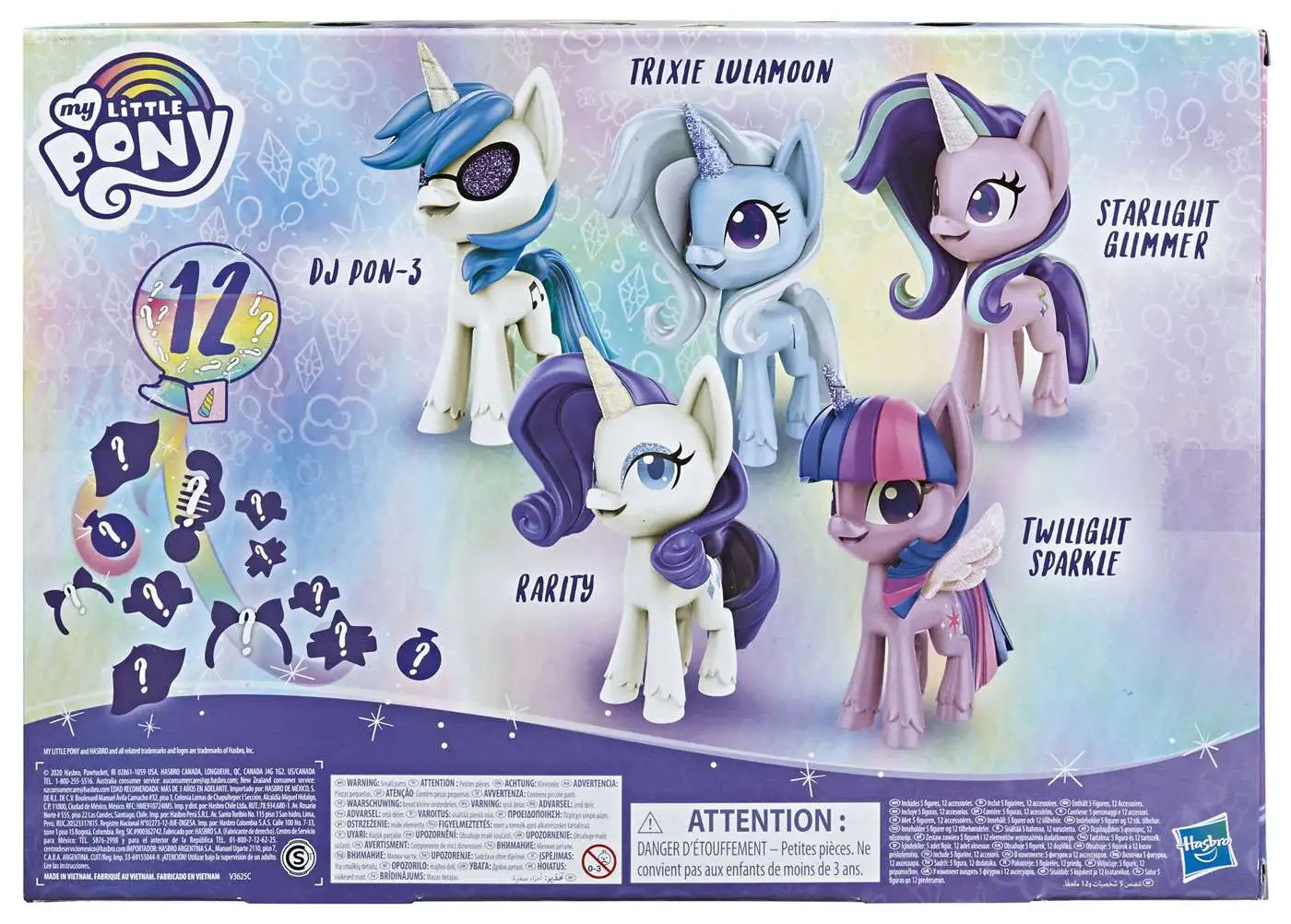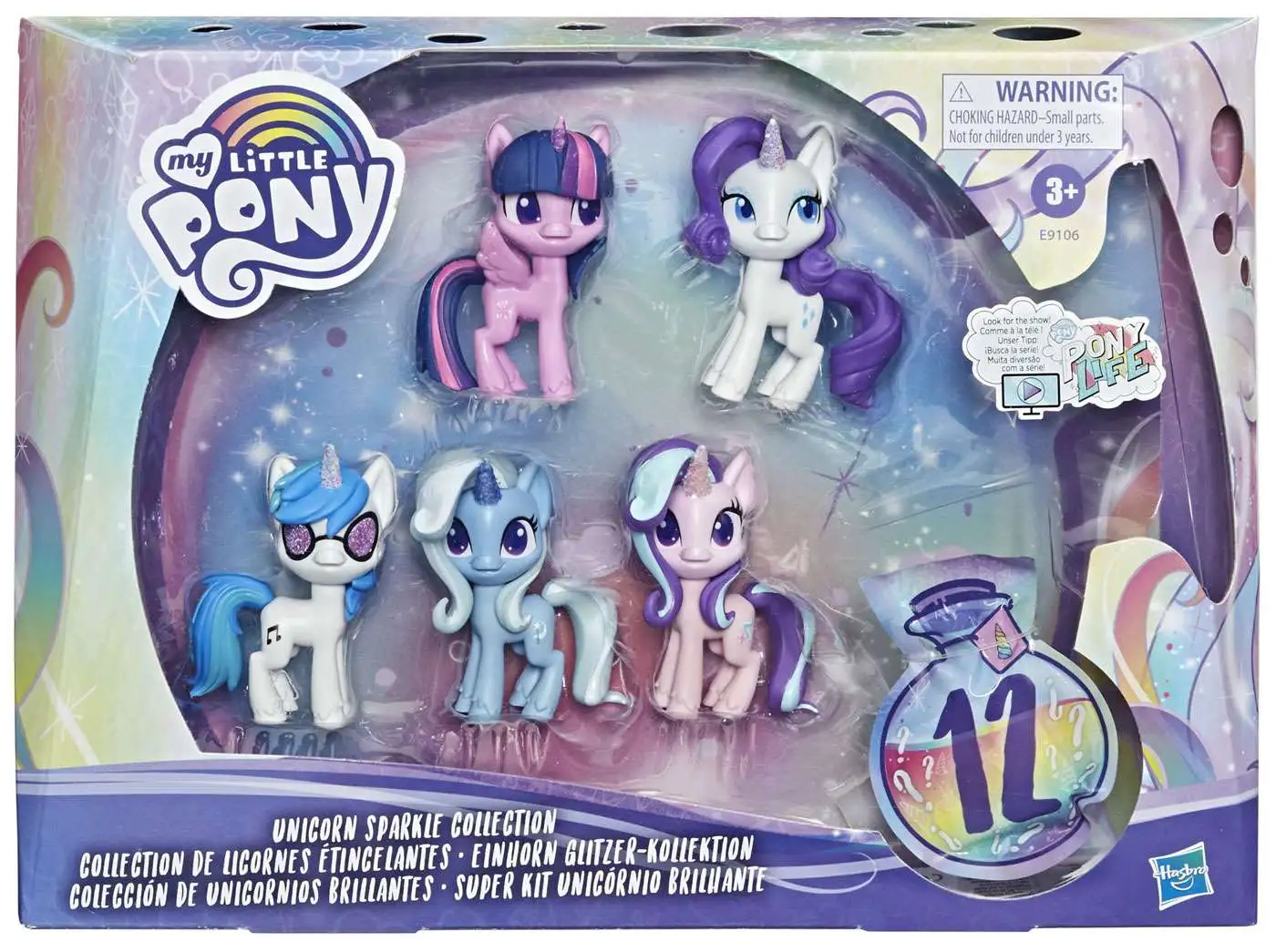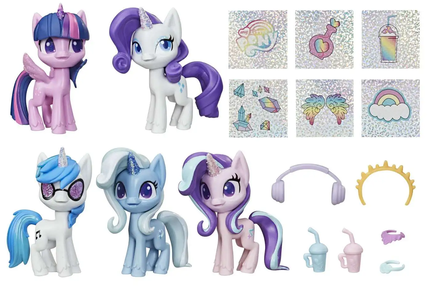 Friendship is Magic characters with a reimagined style and design! This set of 5, 3-inch glittery pony toys is inspired by the popular pony characters from the My Little Pony entertainment: Twilight Sparkle, Rarity, Starlight Glimmer, Trixie Lulamoon, and DJ Pon-3, that all feature sparkly unicorn horns! The Unicorn Sparkle Collection Set comes with 12 character-inspired accessories, all of which are hidden for a surprise! Tear open the potion bottle-themed pack and pour out the accessories to reveal surprise fashion, iridescent stickers, and other accessories. Dress each pony up to pretend they’re going on exciting adventures!
