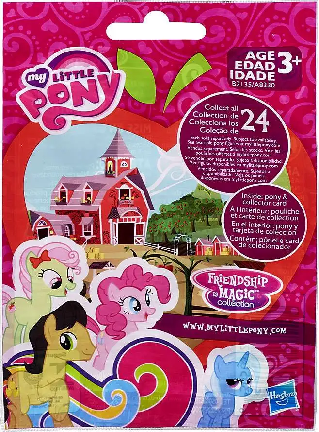 Get a surprise mini-pony with this Surprise Bag! Each bag includes 1 mini-pony and there are 24 for you to add to your collection (each sold separately). Collect them all to complete your pony rainbow! My Little Pony and all related characters are trademarks of Hasbro. Purchasers will randomly receive 1 of 24 ponies.