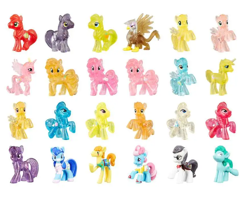 Get a surprise mini-pony with this Surprise Bag! Each bag includes 1 mini-pony and there are 24 for you to add to your collection (each sold separately). Collect them all to complete your pony rainbow! My Little Pony and all related characters are trademarks of Hasbro. Purchasers will randomly receive 1 of 24 ponies.