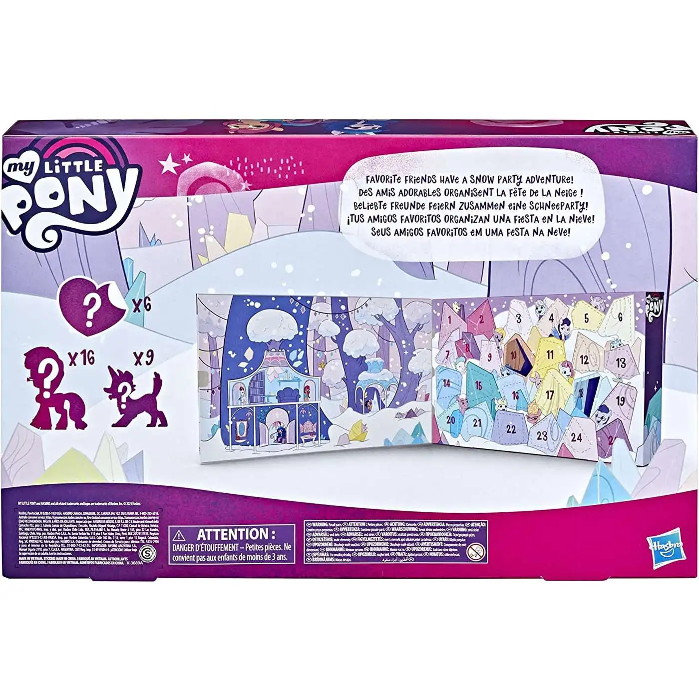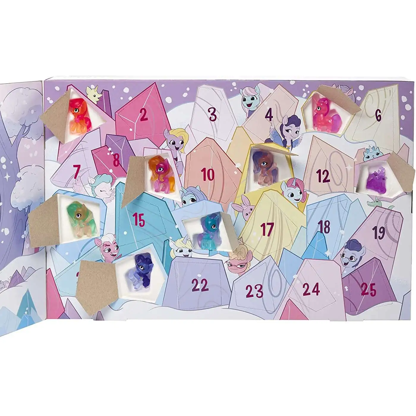 Meet a group of Unicorn, Pegasus, and Earth Pony friends! Imagine favorites from the world of My Little Pony: A New Generation are having a snow party adventure in the magical Unicorn home of Bridlewood Forest. Count down to a holiday event with 25 days of surprises! Snow Party Countdown advent calendar for kids features 25 gem-shaped cardboard doors. Open one door each day for 25 days of surprise reveals, or reveal all of the mysteries at once. Includes 16 mini pony figures in an adorable 1.5-inch scale, 9 pets with Unicorn horns, and 6 stickers. 31 surprises in all! Characters include Sunny Starscout, Izzy Moonbow, Princess Petals, Zipp Storm, and more. Sweet present-themed package comes with a wintery story scene of Bridlewood Forest. Kids can use this as a background for imagining movie-inspired adventures! This My Little Pony movie toy makes a great winter holiday gift for kids ages 3 years old and up. My Little Pony and all related characters are trademarks of Hasbro.