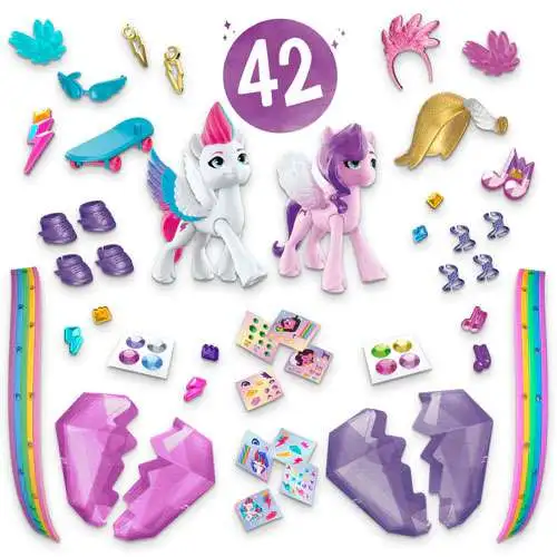 Get to know Princess Petals and Zipp Storm: Pegasus sisters from Zephyr Heights! These princesses are royally unique. Crack open the magic of surprises with Crystal Adventure Sisters. Includes articulated 3-inch Princess Petals pink pony figure and Zipp Storm white pony figure. Both have molded hair in their signature styles and Cutie Marks on one side. Crack the reusable crystal-shaped containers in 2 to reveal hidden story and customization pieces. Comes with 40 accessories, including sticker sheets and charms for decorating the ponies and their outfit accessories. Includes 2 friendship bracelets and temporary tattoos for kids.