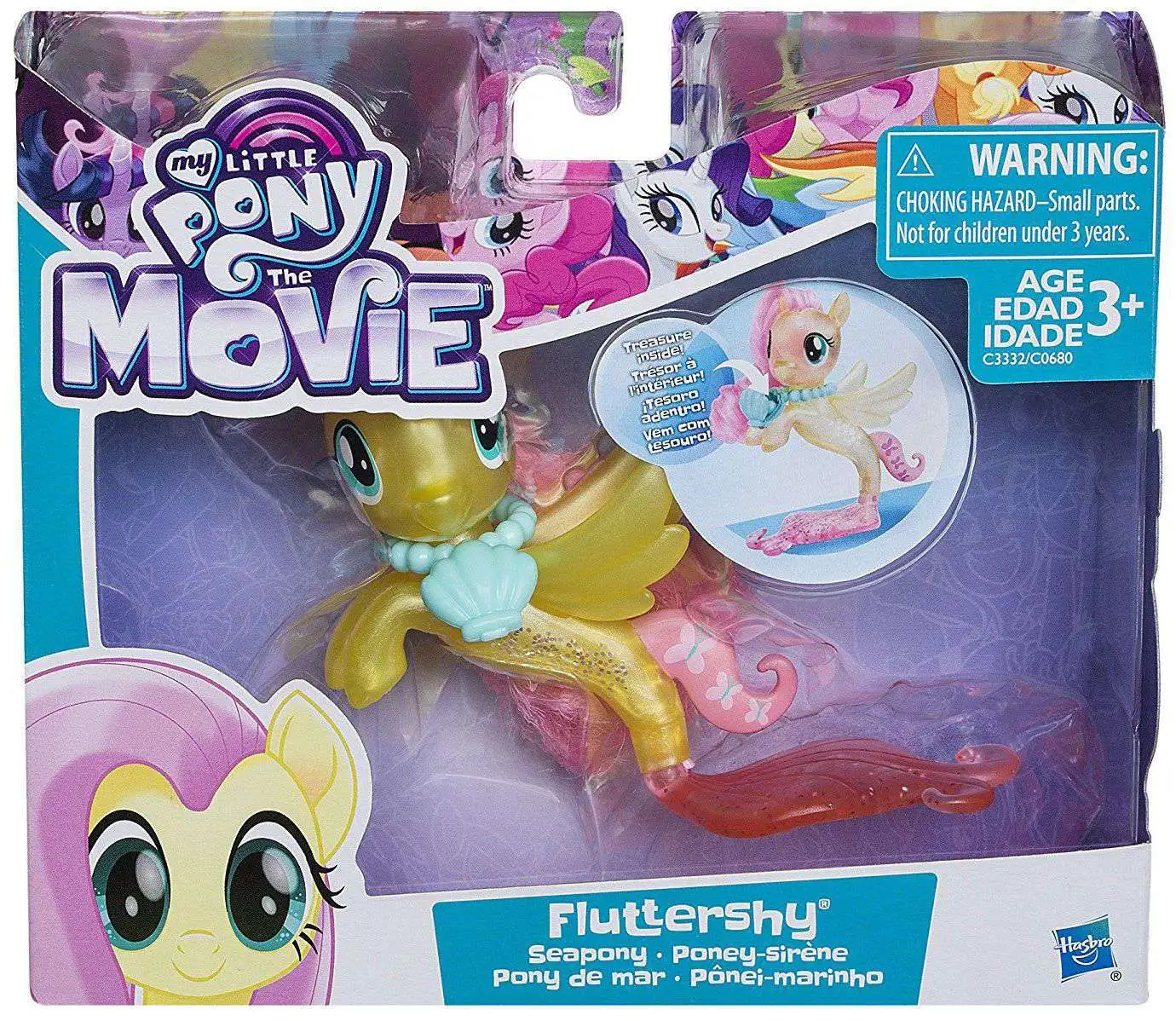 Fluttershy shimmers when she swims! Inspired by the My Little Pony the Movie, this 3-inch Fluttershy seapony figure has a beautiful mermaid-like, poseable tail decorated with glitter. She also has a cutie mark on her back fin. Open her necklace to reveal a treasure hiding inside! Imagine movie-inspired adventures in Seaquestria with My Little Pony friends figures (Each sold separately. Subject to availability).