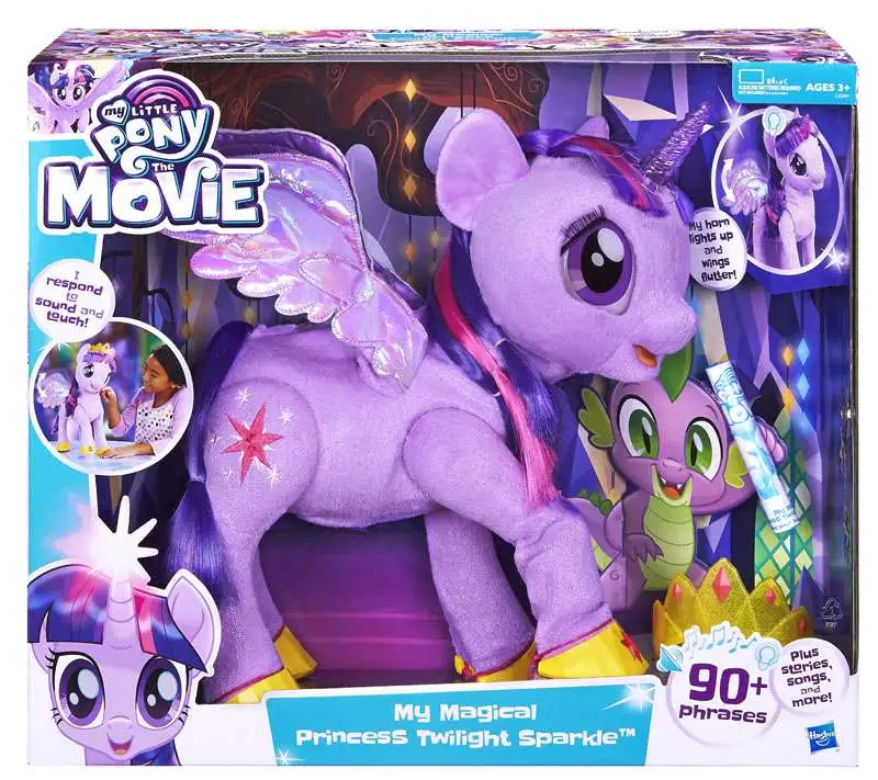 Discover the magic of friendship with the My Magical Princess Twilight Sparkle figure, a pony with Pegasus wings and a responsive unicorn horn! While interacting with her, she can move her head and hoof, say 90 plus phrases, and light up her horn. Touch her horn to hear her talk about her magical spells! Press the Star Button on her hoof to hear her friendship advice, stories or songs, too! Watch as she flutters her beautiful wings and imagine her soaring over Equestria. She has poseable legs so kids can help her sit or stand. Princess Twilight Sparkle also has a beautiful mane and tail to style and a tiara to complete her look. Explore how powerful friendship can be with this beautiful, interactive pony companion!