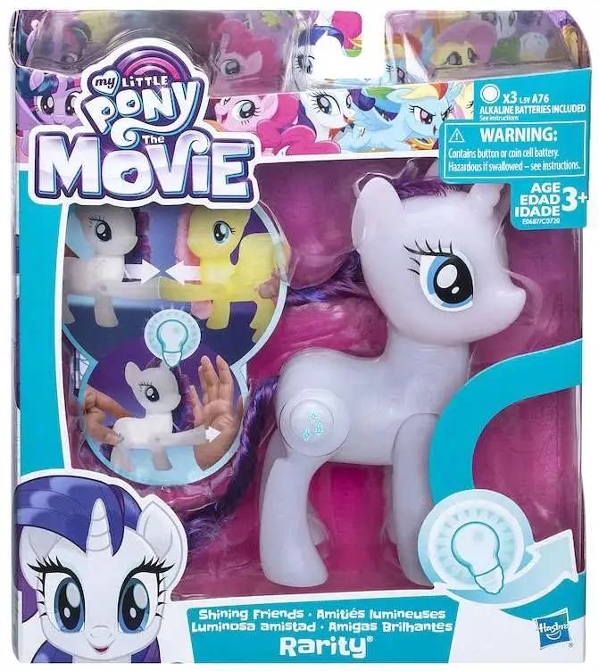 Rarity Pony’s friendship glows like a shiny gem! Light up play time with the My Little Pony Shining Friends Rarity figure. Give her a high five and watch her glow. It’s fun to pretend the power of friendship creates the light. When the Rarity and Fluttershy (each sold separately) figures are together, kids can play out scenes where they share friendship moments when these 2 pony figures “hoof-bump”, their lights shine, too! (Figures each sold separately. Subject to availability).
