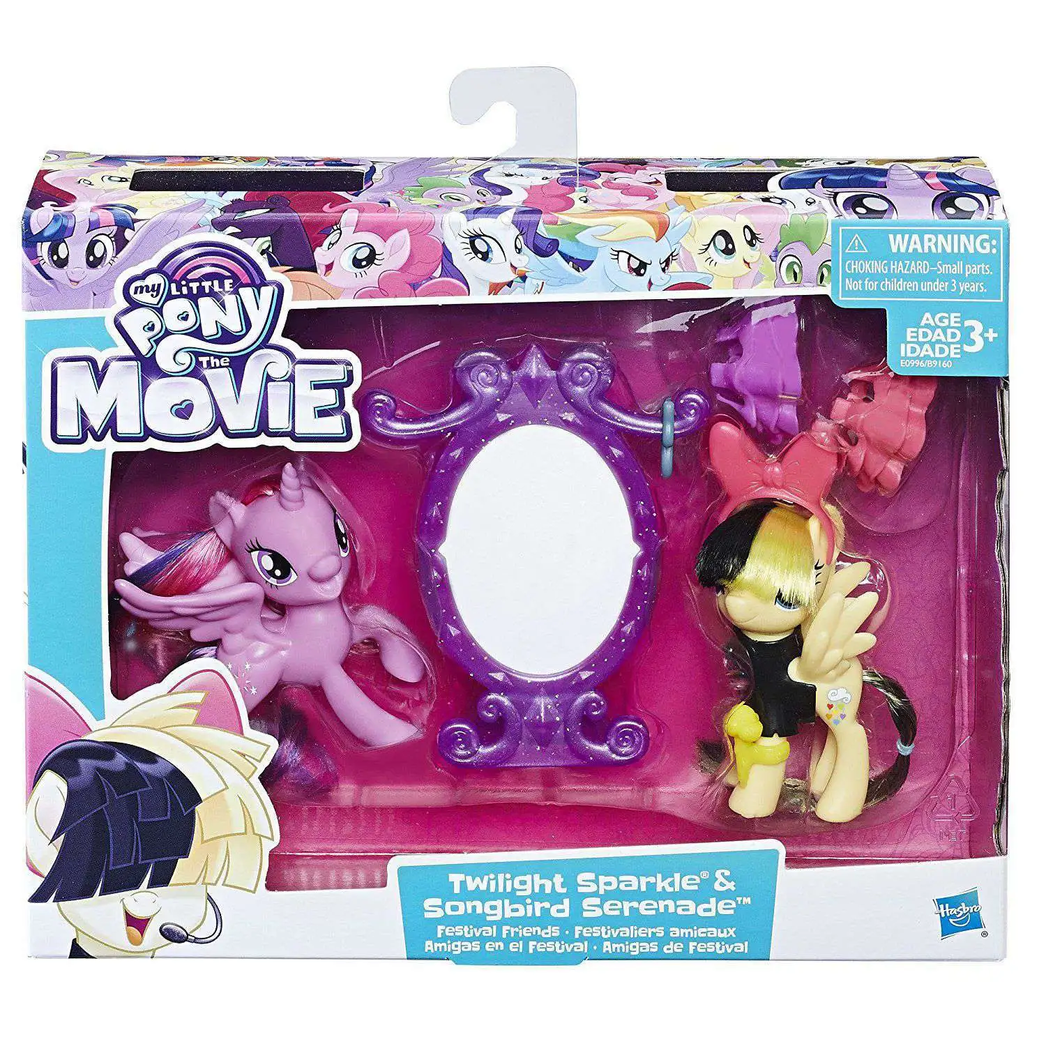Twilight Sparkle and Songbird Serenade are superstars of friendship! Inspired by My Little Pony: The Movie, imagine stories between the Twilight Sparkle and Songbird Serenade figures in the My Little Pony Festival Friends Set! Also look for My Little Pony: The Movie Pinkie Pie and Princess Skystar Party Friends and Rarity and Capper Dapperpaws Styling Friends sets to act out more favorite movie scenes.