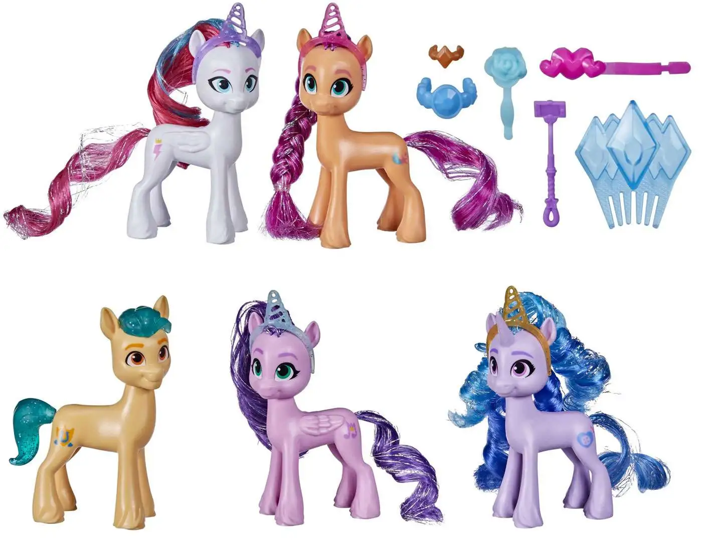 Join the sparkle squad with the Mane 5: a group of Pegasus, Unicorn, and Earth Pony friends! Meet Sunny Starscout, Hitch Trailblazer, Princess Petals, Zipp Storm, and Izzy Moonbow. These 5 unique ponies have sparkling personalities!