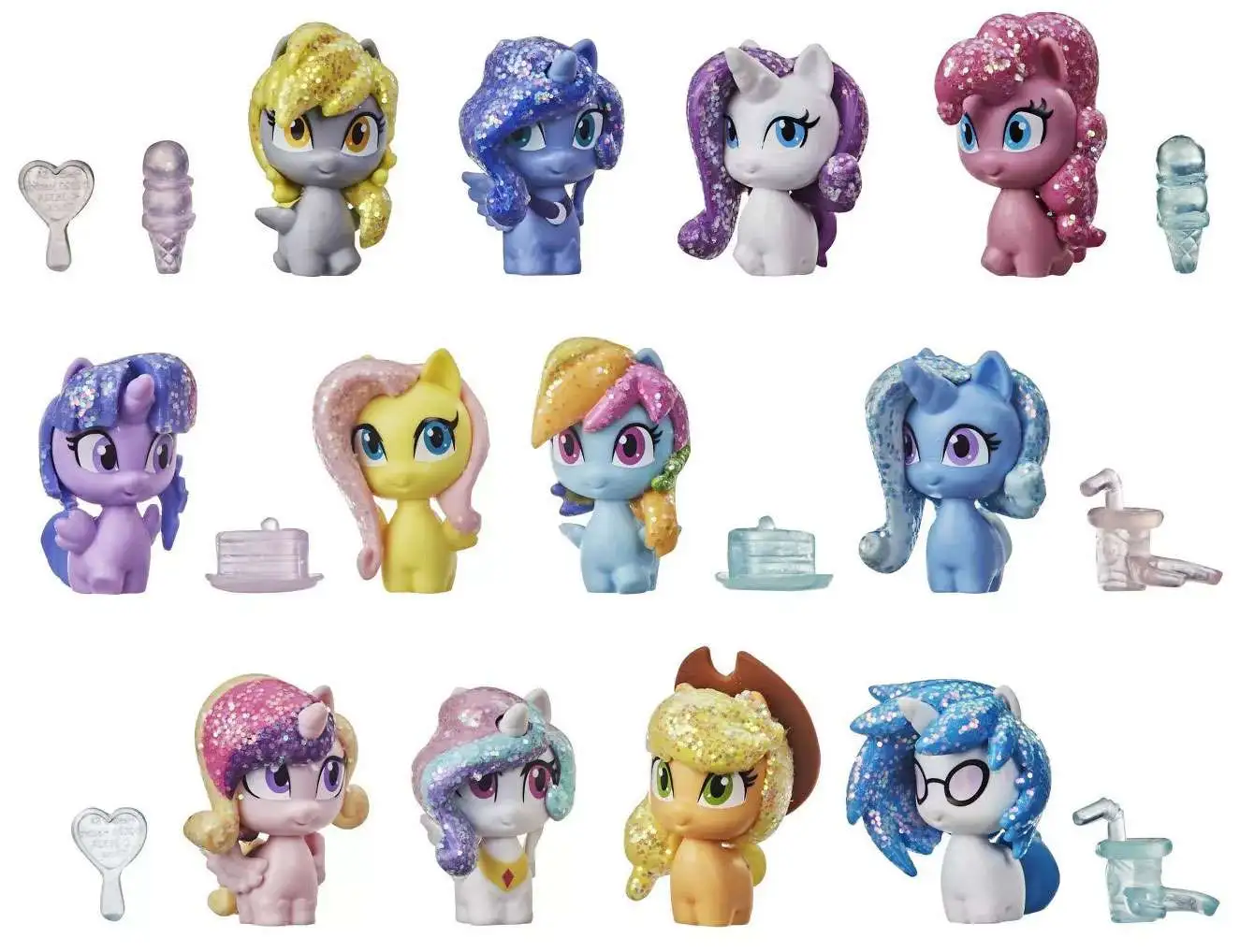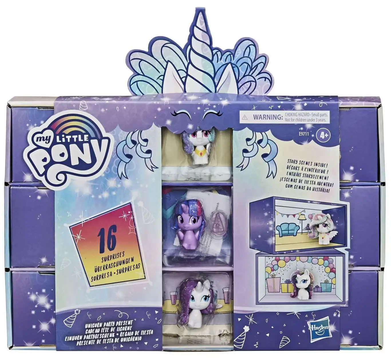 Unicorn parties are the best parties! The Unicorn Party Present collection pack includes 20 party-themed pieces: 12 My Little Pony figures and 8 accessories. 16 pieces are hidden for a surprise party mystery! 1.5-inch pony figures include Princess Celestia, Twilight Sparkle, and Rarity. Figures have molded manes and tails and feature glittery hair for a special party look. Figures and accessories come in an adorable birthday present-inspired package, making this collection set a great birthday gift for kids ages 4 years old and up. Open the present to discover the party-themed story scenes inside. Use the box as a My Little Pony playset to imagine unicorn party stories.