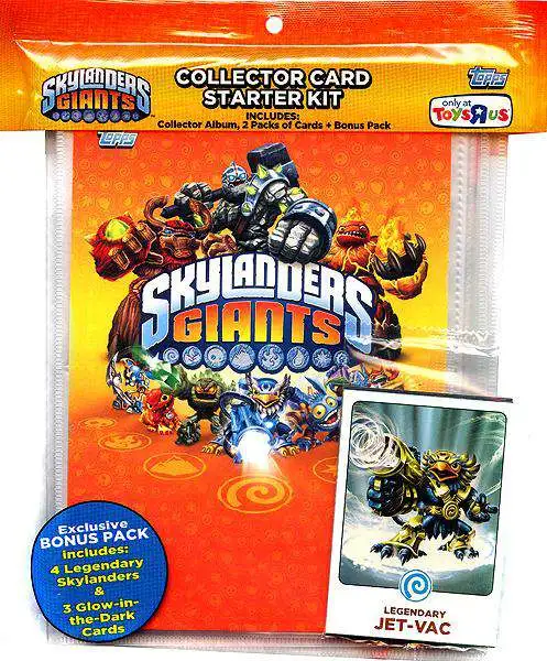 Topps Skylanders Giants Trading Cards tell the story behind each character for a high level of engagement! Starter Kit Includes: Collector Album, 2 Packs of Cards (6 Cards per pack) & 1 Bonus Pack which includes 4 Legendary Skylanders & 3 Glow-in-the-Dark Cards.